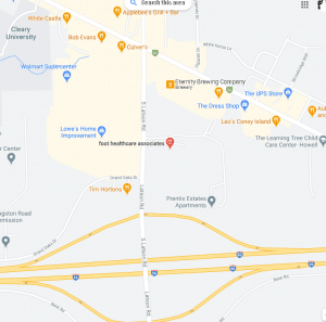 Below you will find a map that includes complete driving directions to our Howell foot doctor office. Our Howell Foot Doctors (Podiatrists and Surgeons) are conveniently located just off of I-96 in the Ascension Health Medical Building (just across from the Home Depot and Walmart Super center) on Latson Road.